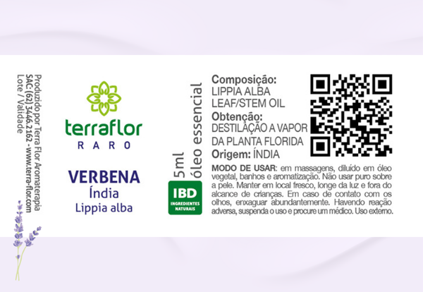 O óleo essencial de Verbena é nativo do Brasil. A espécie é cultivada em outras regiões, e por limitações na produção brasileira, muitas vezes obtemos o óleo de outros países. Verbena é especial para cuidar da saúde da mulher. Associado aos ciclos femininos, é essencialmente calmante e relaxante. Por apresentar alta concentração de linalol, composto químico tranquilizante, promove relaxamento profundo, melhora a qualidade de sono, alivia stress, estados de ansiedade, agitação, sendo muito eficaz para tratar tensão nervosa. No plano físico é antiinflamatório, analgésico, cicatrizante, digestivo e hipotensor.